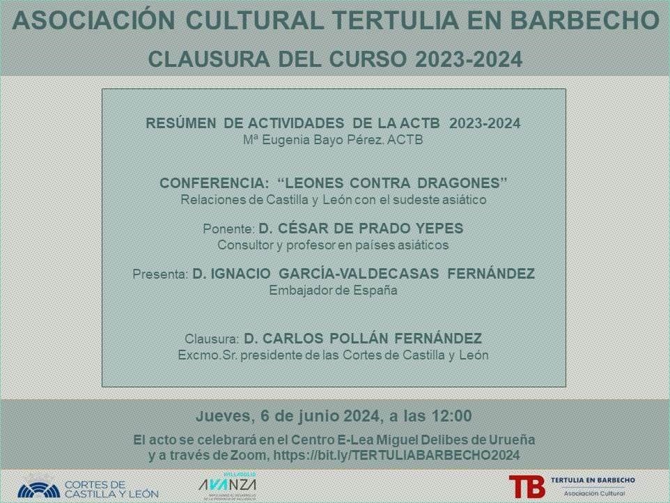Programa PRIMERA PARTE: Narciso Alonso Cortés Día 17 17:00 horas: Algunos rasgos destacados de la figura de Alonso Cortés José Luis Puerto, Premio de las Letras de Castilla y León María Antonia Salvador, catedrática de Geografía e Historia del Instituto Zorrilla Martín Rodríguez Rojo, catedrático emérito de la Universidad de Valladolid 18:00 horas: descanso 18:30 horas: Algunas aficiones de Narciso Alonso Cortés: la música clásica, la fotografía y la zarzuela Carlos Igualador, licenciado en Filosofía y Letras Julio Alonso Zancada, expresidente de la Asociación Fotográfica Vallisoletana Santos Martínez Herrero, Asociación de Amigos de la Zarzuela de Valladolid 19:30 horas: descanso 20:00 horas: […]